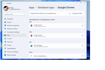 20 tips voor iedere Windows 11 gebruiker 01Windows 11 heeft allerlei nieuwe functies, verbeteringen en aanpassingen in vergelijking met eerdere versies van hun besturingssysteem.In dit artikel 20 tips om het beste uit Windows 11 te halenTip 1: Een andere internetbrowser instellenAllereerst is Microsoft Edge de standaardbrowser op Windows 11. Hoewel deze veel verbeterd is, geeft u misschien de voorkeur aan een andere browser zoals Google Chrome, Brave, Firefox, Vivaldi of iets anders.Toen Windows 11 voor het eerst werd gelanceerd, was het niet eenvoudig om de standaardbrowser te wijzigen.Na veel kritiek vanuit de community, is dit proces vereenvoudigd. Hier leest u hoe u dat doet:1.Ga in de taakbalk naar de Startknop, klik met de rechtermuisknop en selecteer Instellingen.2.Een andere manier om de Instellingen app te openen, is met de sneltoets: Windows-toets + I.3.Klik in het linkermenu op Apps.4.Selecteer Standaard-apps aan de rechterkant. Zoek uw favoriete browser die op uw computer is genstalleerd en selecteer deze.5.In plaats van handmatig de standaardbrowser voor elk bestandstype in te stellen, gaat u terug naar boven en klikt u op Standaard instellen. Dit stelt uw browser in als standaard voor de meeste bestandstypen die worden vermeld.Voor sommige bestandstypen moet u deze handmatig selecteren en op Standaard instellen klikken.