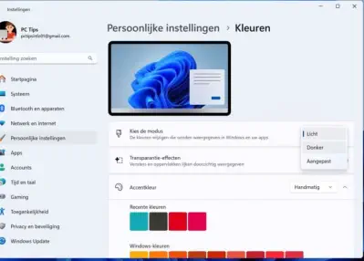 20 tips voor iedere Windows 11 gebruiker 02Windows 11 heeft allerlei nieuwe functies, verbeteringen en aanpassingen in vergelijking met eerdere versies van hun besturingssysteem.In dit artikel 20 tips om het beste uit Windows 11 te halenTip 2: Donkere Modus InschakelenTerwijl u toch in Instellingen bent, kunt u de donkere modus inschakelen. Dit is niet alleen rustiger voor uw ogen, maar kan ook de batterijduur van uw laptop verlengen.1.Ga naar Persoonlijke instellingen.2.Vervolgens naar Kleuren.3.Selecteer in het dropdown-menu Donker.