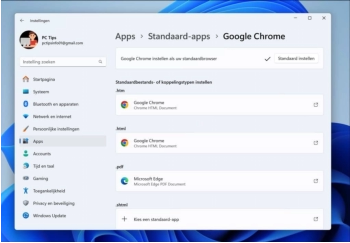 20 tips voor iedere Windows 11 gebruiker 01Windows 11 heeft allerlei nieuwe functies, verbeteringen en aanpassingen in vergelijking met eerdere versies van hun besturingssysteem.In dit artikel 20 tips om het beste uit Windows 11 te halenTip 1: Een andere internetbrowser instellenAllereerst is Microsoft Edge de standaardbrowser op Windows 11. Hoewel deze veel verbeterd is, geeft u misschien de voorkeur aan een andere browser zoals Google Chrome, Brave, Firefox, Vivaldi of iets anders.Toen Windows 11 voor het eerst werd gelanceerd, was het niet eenvoudig om de standaardbrowser te wijzigen.Na veel kritiek vanuit de community, is dit proces vereenvoudigd. Hier leest u hoe u dat doet:1.Ga in de taakbalk naar de Startknop, klik met de rechtermuisknop en selecteer Instellingen.2.Een andere manier om de Instellingen app te openen, is met de sneltoets: Windows-toets + I.3.Klik in het linkermenu op Apps.4.Selecteer Standaard-apps aan de rechterkant. Zoek uw favoriete browser die op uw computer is genstalleerd en selecteer deze.5.In plaats van handmatig de standaardbrowser voor elk bestandstype in te stellen, gaat u terug naar boven en klikt u op Standaard instellen. Dit stelt uw browser in als standaard voor de meeste bestandstypen die worden vermeld.Voor sommige bestandstypen moet u deze handmatig selecteren en op Standaard instellen klikken.