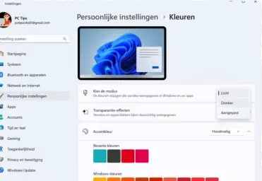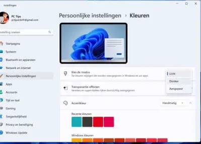 20 tips voor iedere Windows 11 gebruiker 02Windows 11 heeft allerlei nieuwe functies, verbeteringen en aanpassingen in vergelijking met eerdere versies van hun besturingssysteem.In dit artikel 20 tips om het beste uit Windows 11 te halenTip 2: Donkere Modus InschakelenTerwijl u toch in Instellingen bent, kunt u de donkere modus inschakelen. Dit is niet alleen rustiger voor uw ogen, maar kan ook de batterijduur van uw laptop verlengen.1.Ga naar Persoonlijke instellingen.2.Vervolgens naar Kleuren.3.Selecteer in het dropdown-menu Donker.