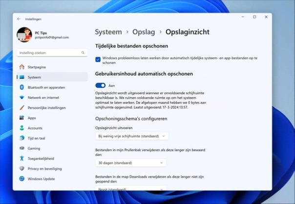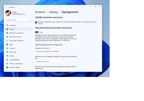 20 tips voor iedere Windows 11 gebruiker 07Windows 11 heeft allerlei nieuwe functies, verbeteringen en aanpassingen in vergelijking met eerdere versies van hun besturingssysteem.In dit artikel 20 tips om het beste uit Windows 11 te halenTip 8: OpslaginzichtOm uw computer soepel te laten werken, is het belangrijk om ongewenste bestanden en andere rommel op te ruimen. Dit kan automatisch worden gedaan met Storage Sense:1.Ga in de Instellingen naar Systeem en klik op Opslag.2.Zet Opslaginzicht aan onder Opslagbeheer. Hiermee wordt automatisch ruimte vrijgemaakt door tijdelijke bestanden en andere ongewenste items te verwijderen.3.U kunt de instellingen aanpassen wanneer u wilt dat het systeem dit automatisch uitvoert.