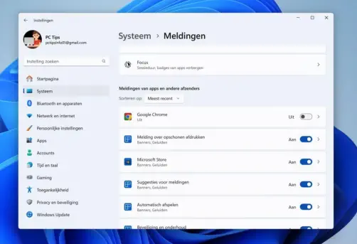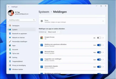 20 tips voor iedere Windows 11 gebruiker 08Windows 11 heeft allerlei nieuwe functies, verbeteringen en aanpassingen in vergelijking met eerdere versies van hun besturingssysteem.In dit artikel 20 tips om het beste uit Windows 11 te halenTip 9: Meldingen UitschakelenNet als op een smartphone kunnen de meldingen op uw pc overweldigend zijn. Om ze uit te schakelen:1.Ga in Instellingen naar Systeem en selecteer Meldingen.2.U kunt hier alle meldingen uitschakelen, maar ik raad aan om in plaats daarvan meldingen van specifieke apps uit te schakelen.3.U kunt dit doen door te klikken op Meldingen van apps en andere afzenders en vervolgens meldingen individueel uitschakelen.